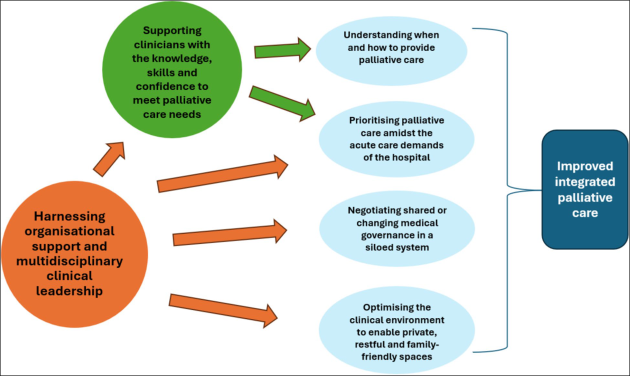 Our findings underscore that improving palliative care in hospitals requires more than individual skill development. It demands system-level change—organisational support, leadership across disciplines, and environments that enable privacy, rest, and family inclusion. We have shown this within Figure 1 below: