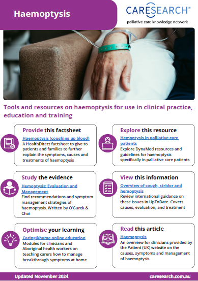 Managing haemoptysis and major bleeding in palliative care can place considerable emotional and practical demands on families and carers, particularly in home settings where they may need to handle complex symptoms with limited support. The responsibility of administering medications and responding to sudden bleeding episodes might contribute to increased stress and anxiety, especially when carers feel uncertain about their ability to manage these situations effectively. [7] Access to guidance, education, and telehealth support could assist carers in navigating these challenges, though the availability and effectiveness of these resources may vary.
