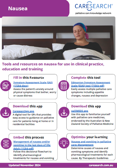Quantifying the severity of nausea is also important for guiding treatment. In Australia, the Symptom Assessment Scale (SAS), part of the Palliative Care Outcomes Collaboration (PCOC), is commonly employed to measure the intensity of nausea. The SAS allows patients to rate their symptoms on a 0-10 scale, providing health professionals with valuable insights for treatment decisions. Regular reassessment is necessary to monitor the effectiveness of interventions and make timely adjustments to the treatment plan. [3]