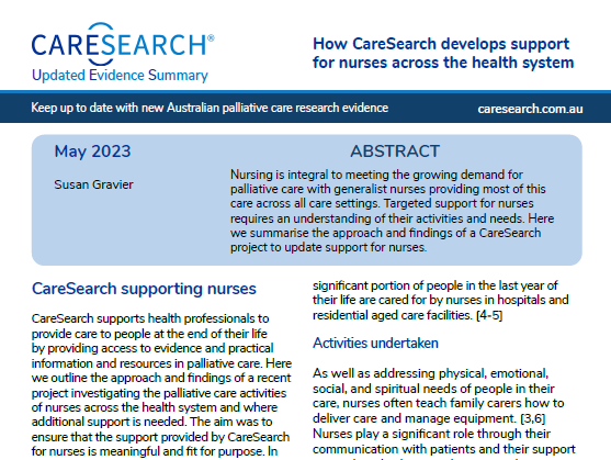 In support of nurses taking on this role, CareSearch has recently updated the Nurses Hub to ensure it is fit for purpose. As outlined in the brief, we reviewed the evidence and collaborated with nurses to define the palliative care-related activities undertaken and the areas in greatest need of support. Here we list our resources and those of our partners developed to address these needs.